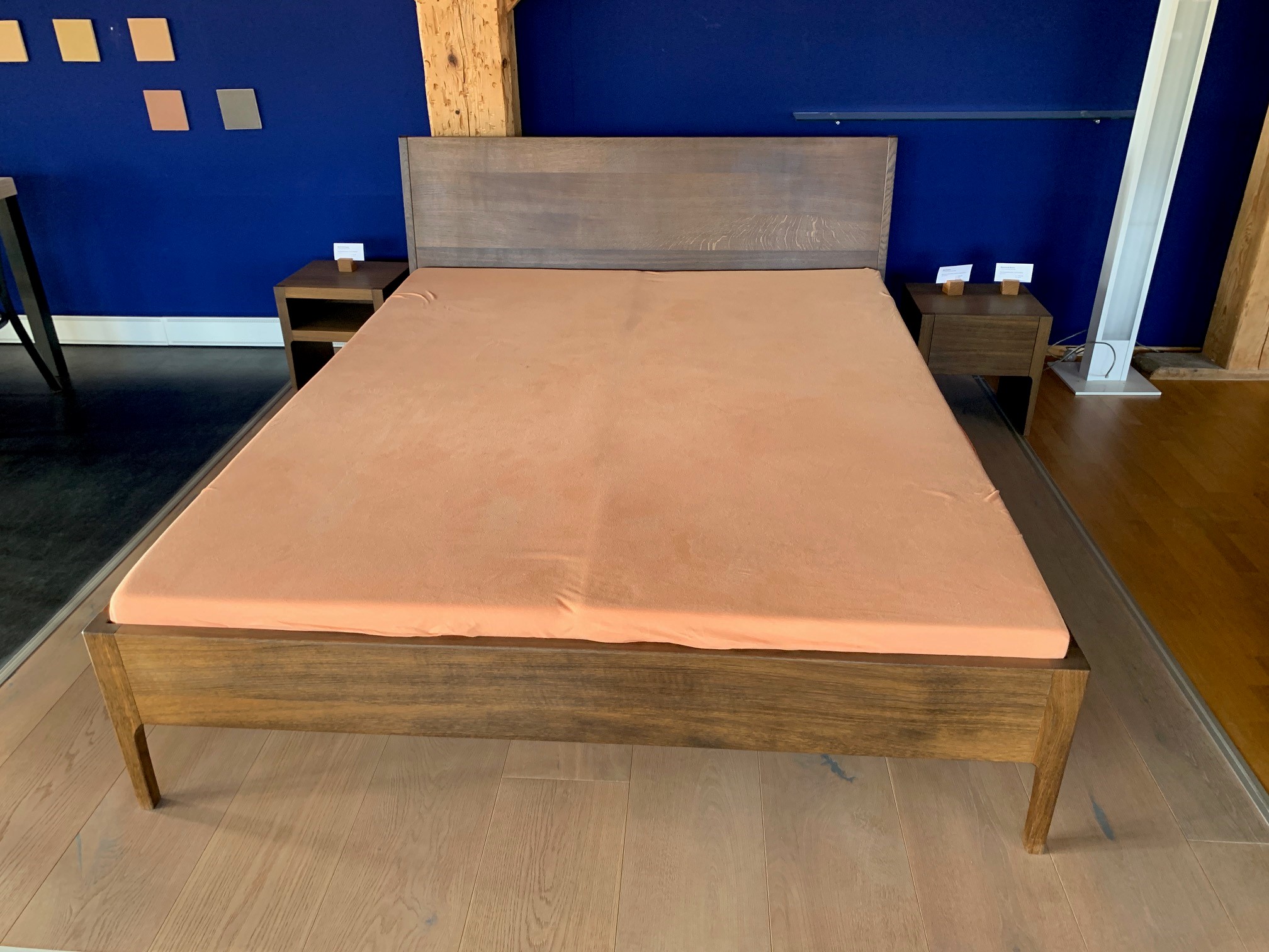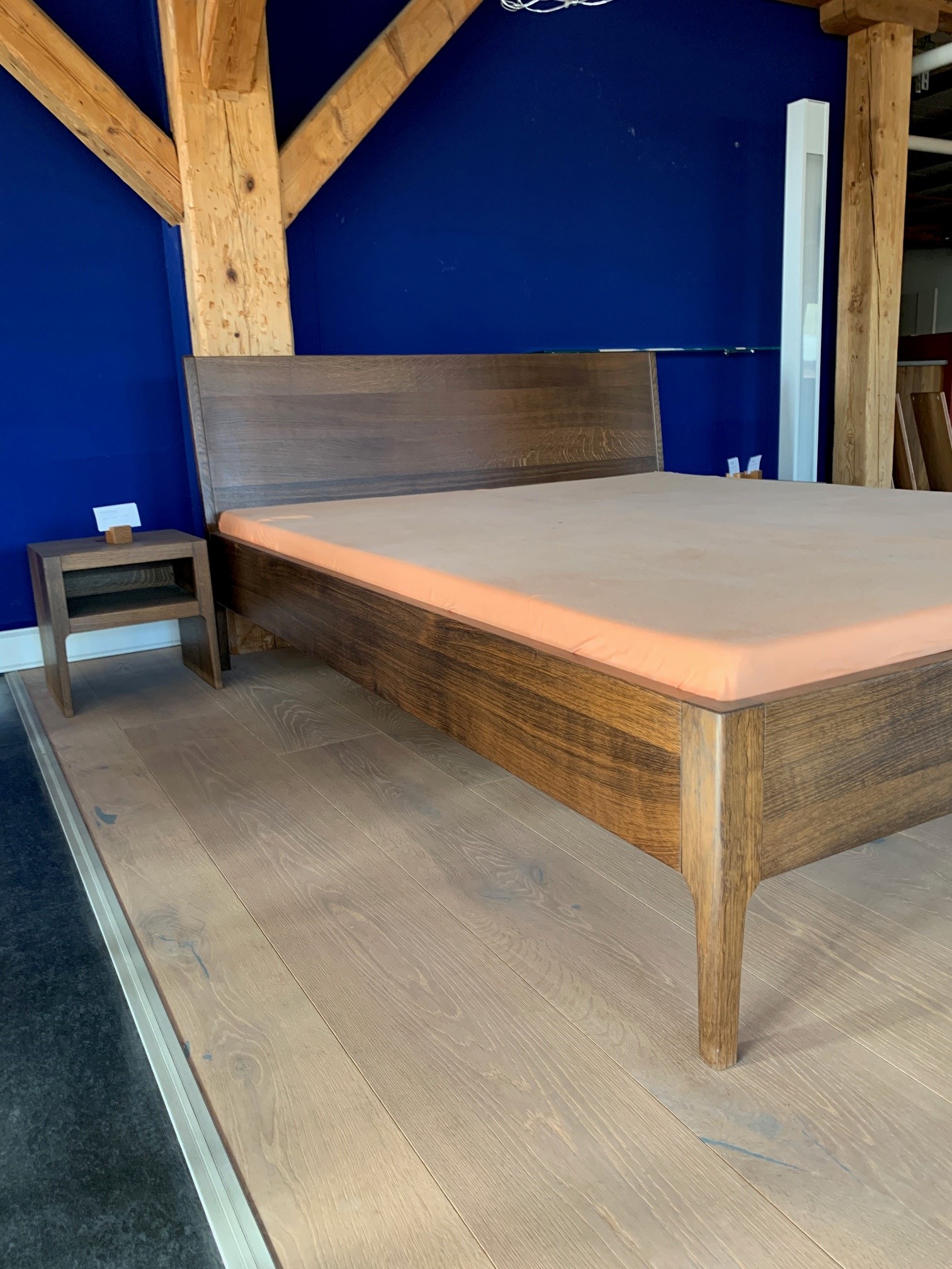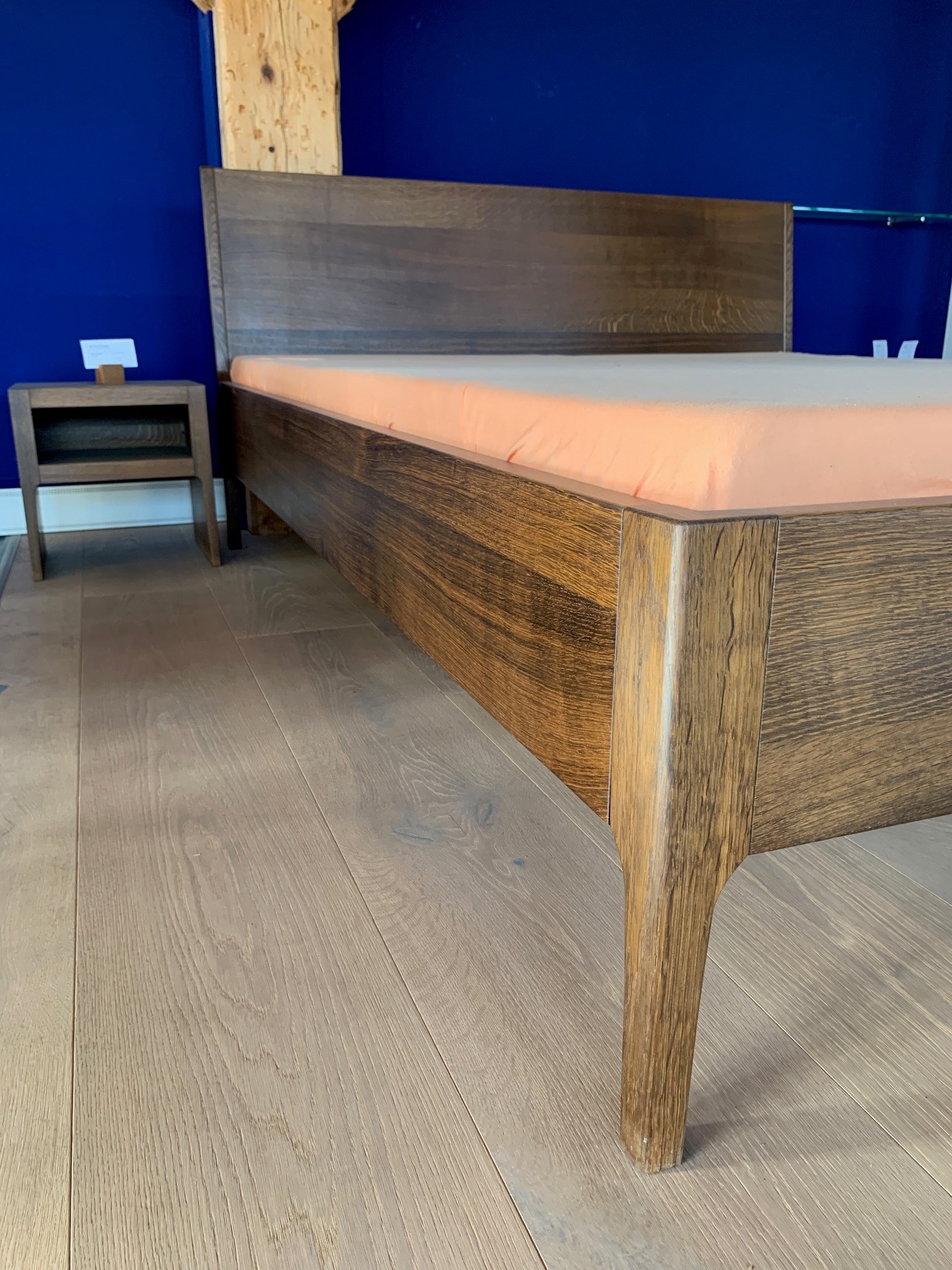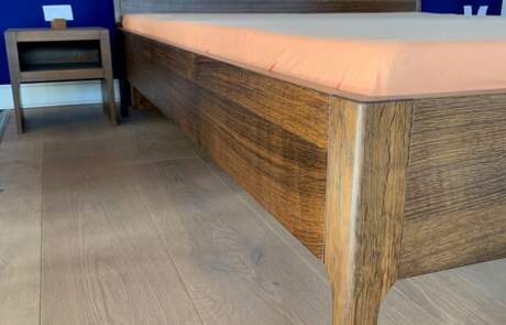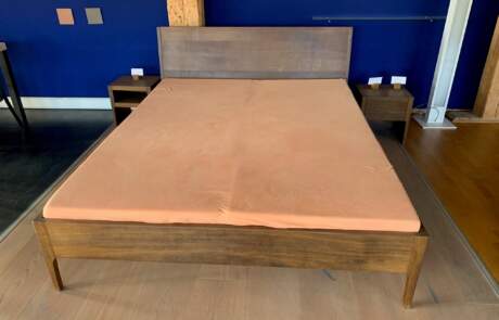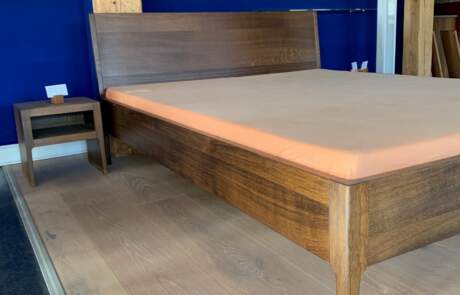 Bettgestell mit Lehne in massiver Räuchereiche. (ohne Bettinhalt)