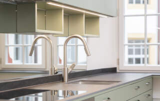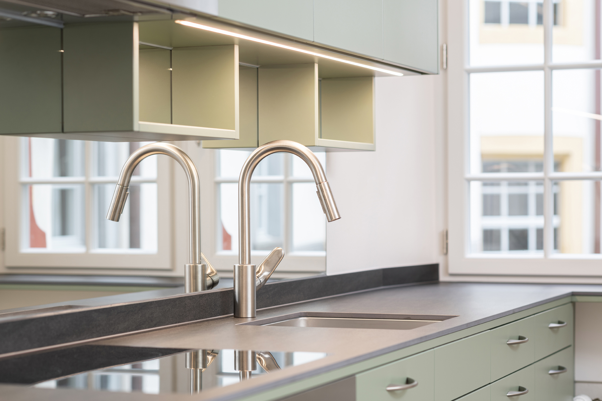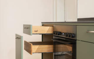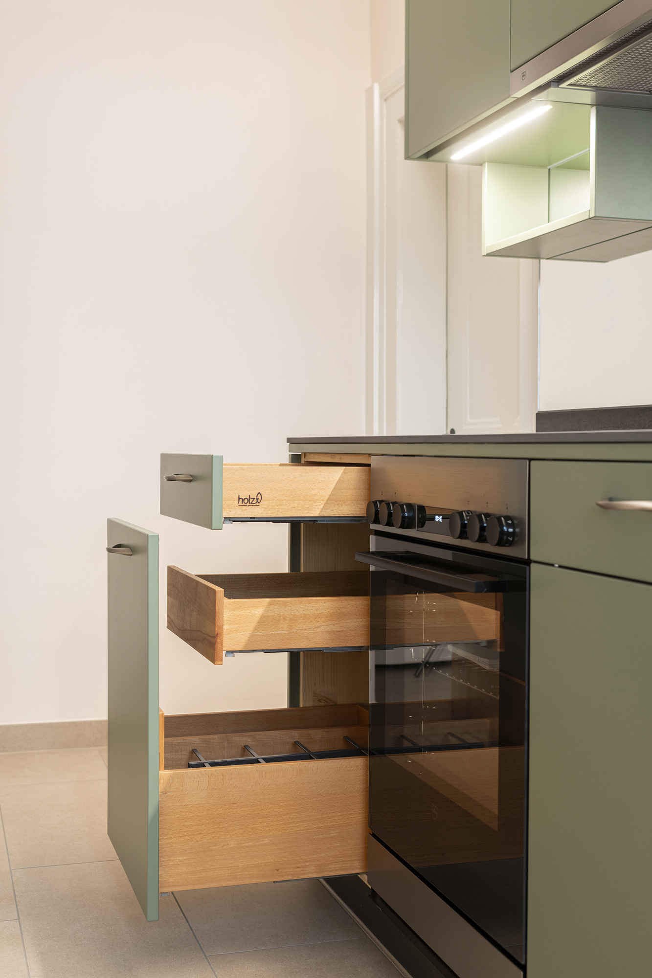 • Pulverbeschichtete Massivholzküche und Badmöbel in Salbei.