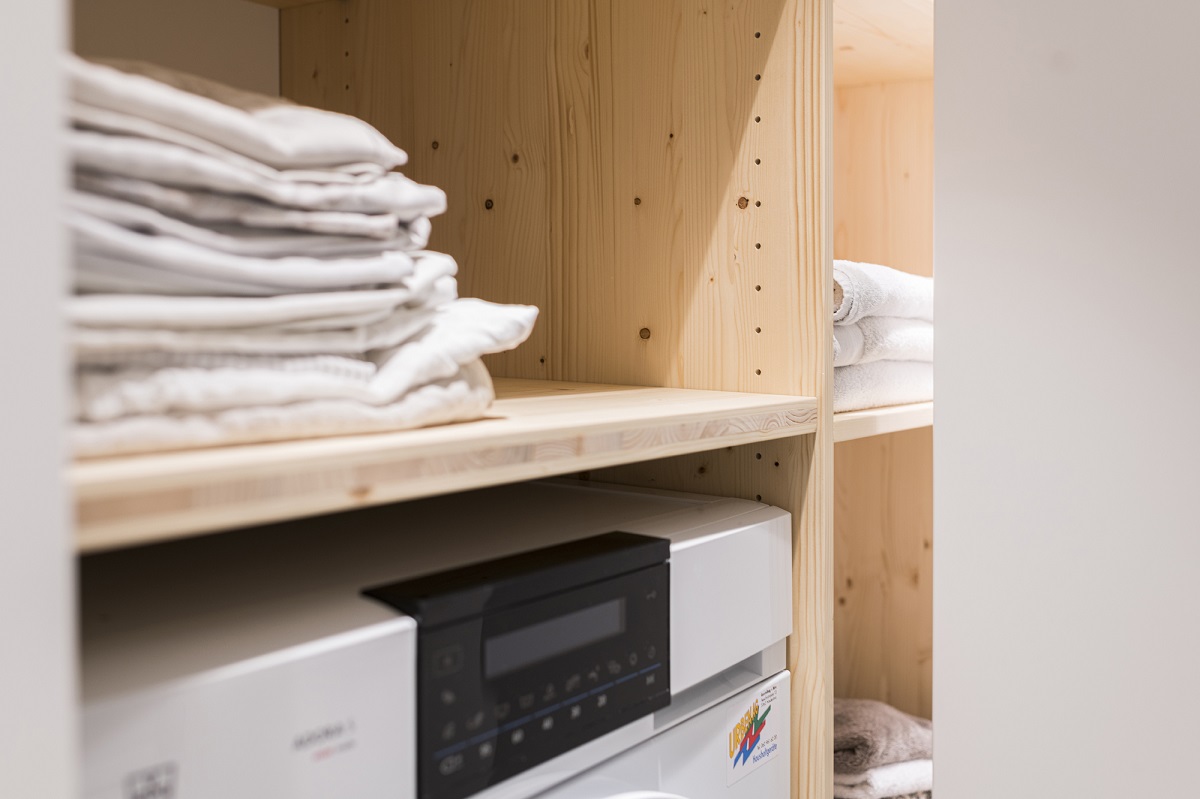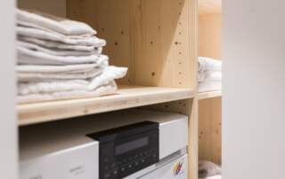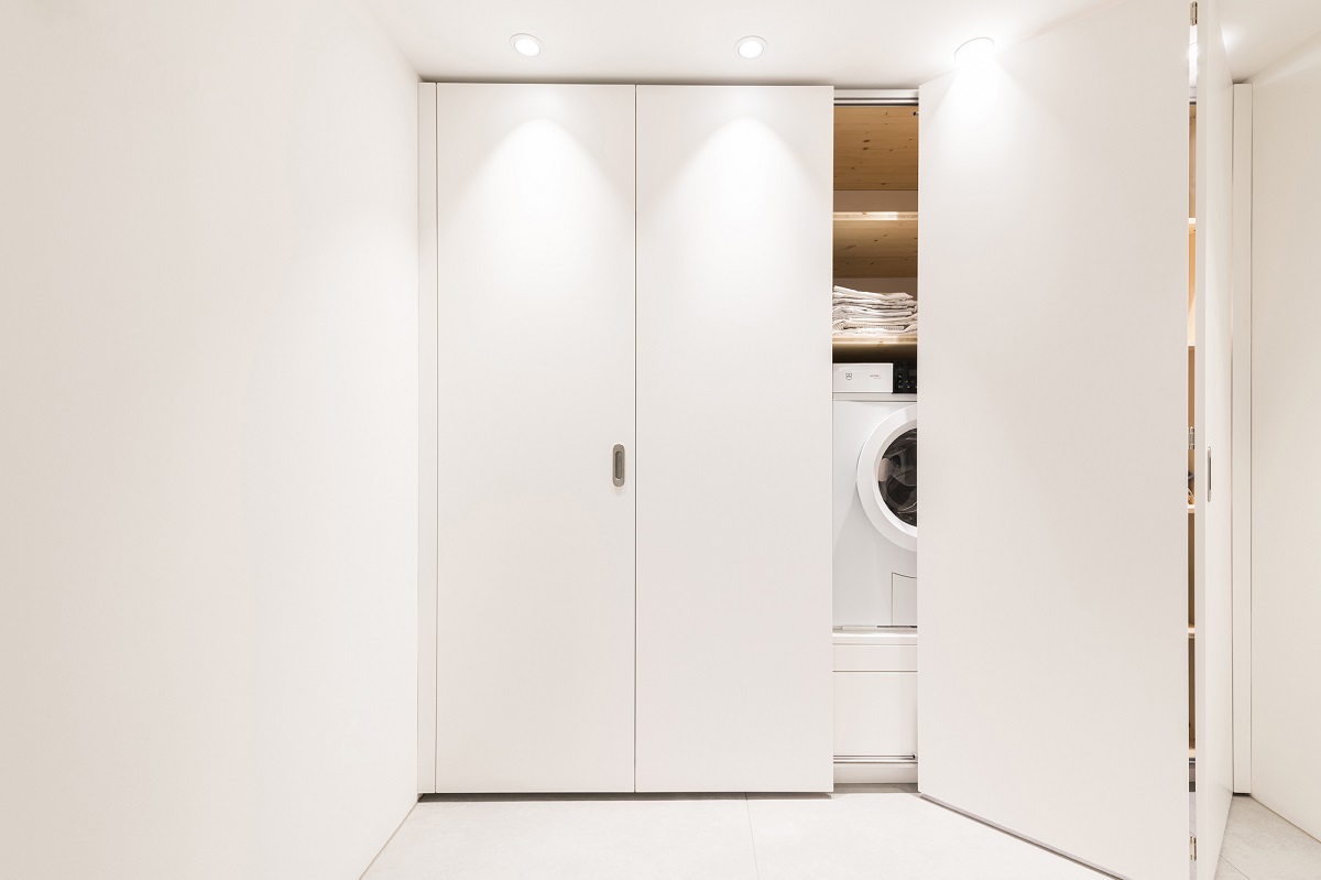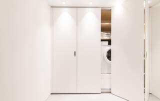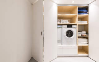 - Einbauschrank Waschküche mit Faltschiebetüren, Fronten MDF weiss lackiert, innen Fichte massiv natur geölt.