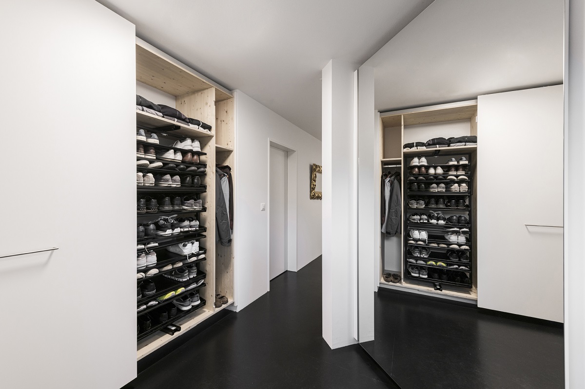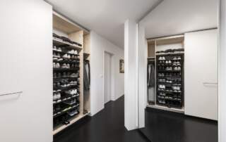 - Einbaumöbel in Form von Schuh- und Garderobenschrank mit Schiebetür, Fronten MDF weiss lackiert. Innen Fichte massiv, natur geölt.