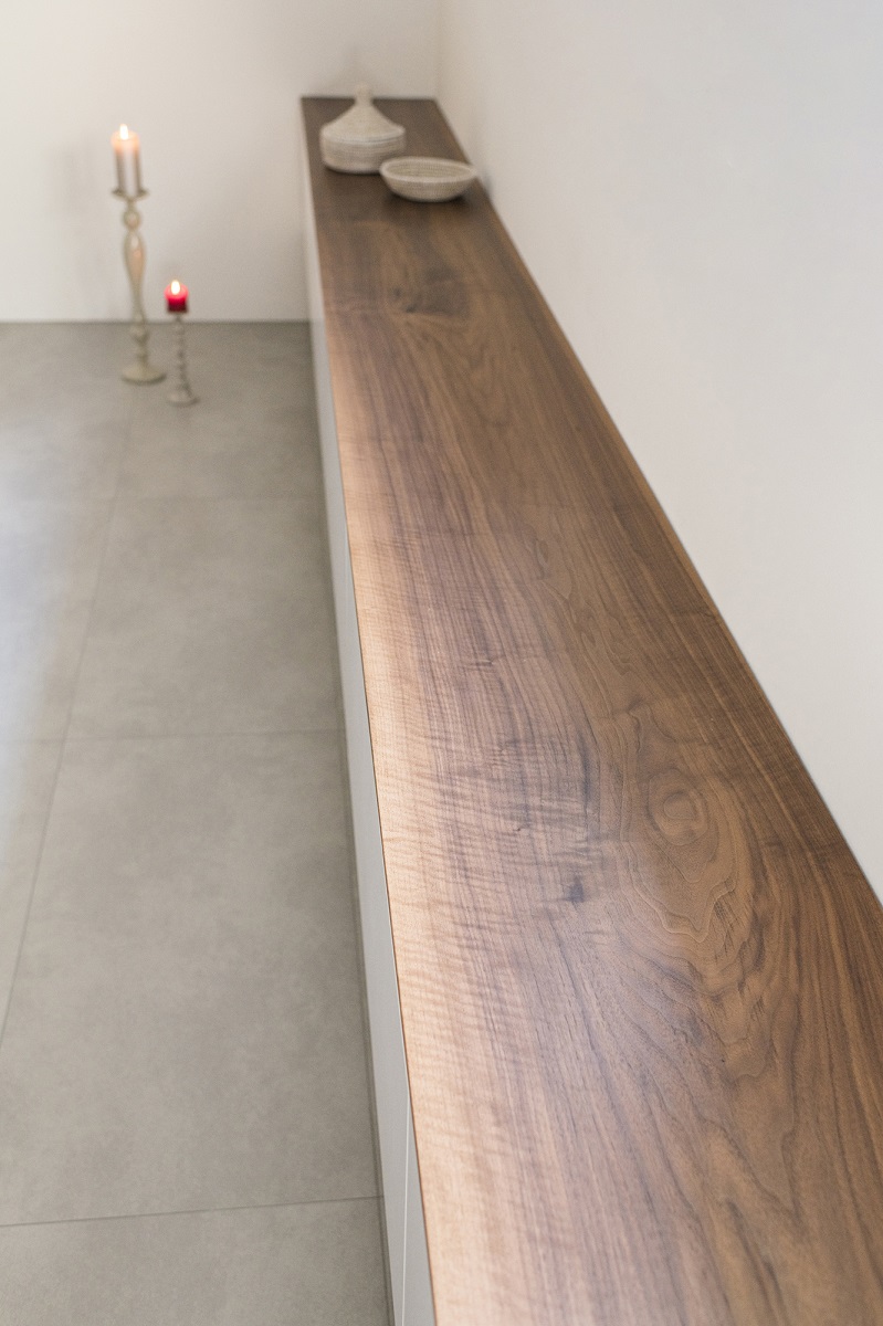 - Sideboard mit Schubladen, Fronten MDF weiss lackiert, Ablage aus Nussbaum massiv, innen Fichte massiv natur geölt.