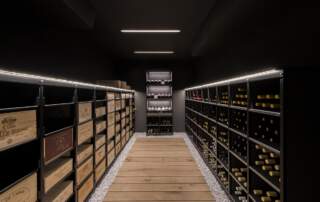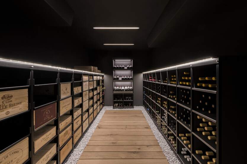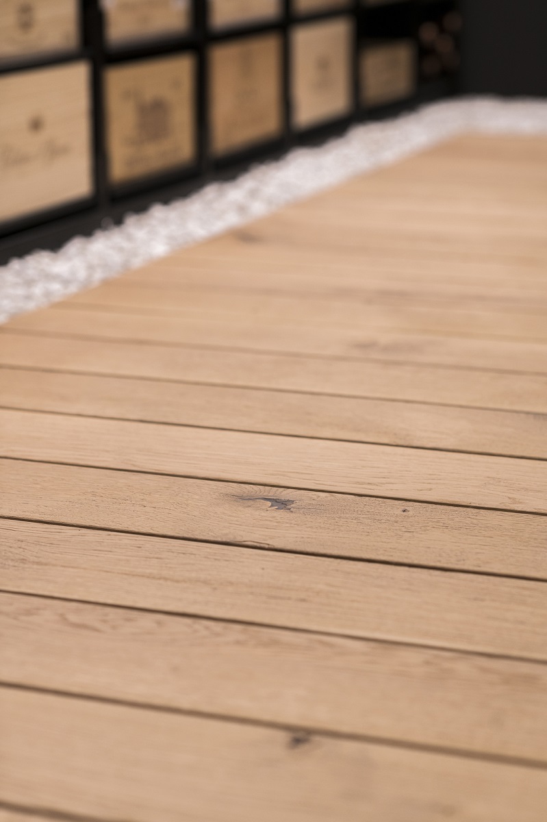- Holzboden in Weinkeller, rustikale Eiche massiv, geschruppt, gebürstet und geölt.