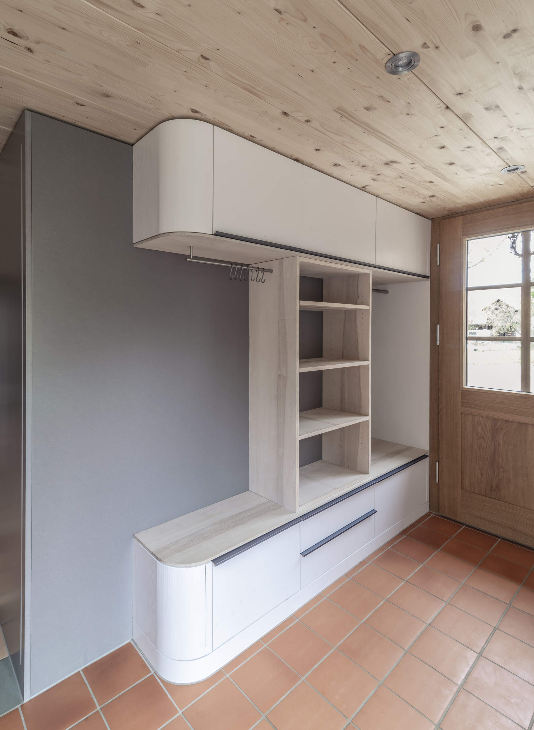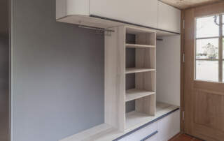 - Garderobe offen in Esche Braunkern massiv, gelaugt und weiss geseift, Fronten in massiver Fichte, leicht gebürstet und lackiert.