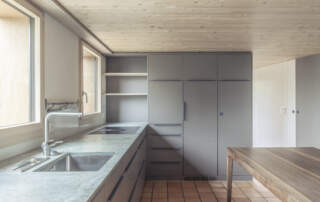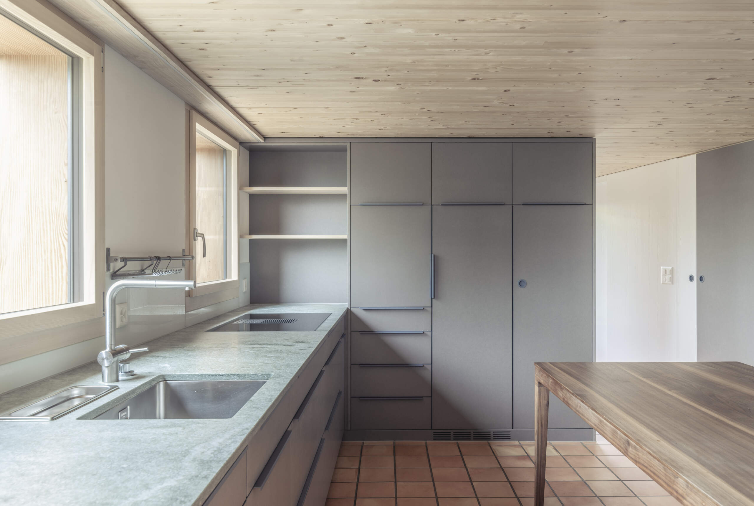 - Massivholzküche MDF eingefärbt in grau und anthrazit (innen Fichte und Buche massiv) mit einer Verde Spluga Quarzit Abdeckung.