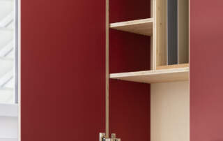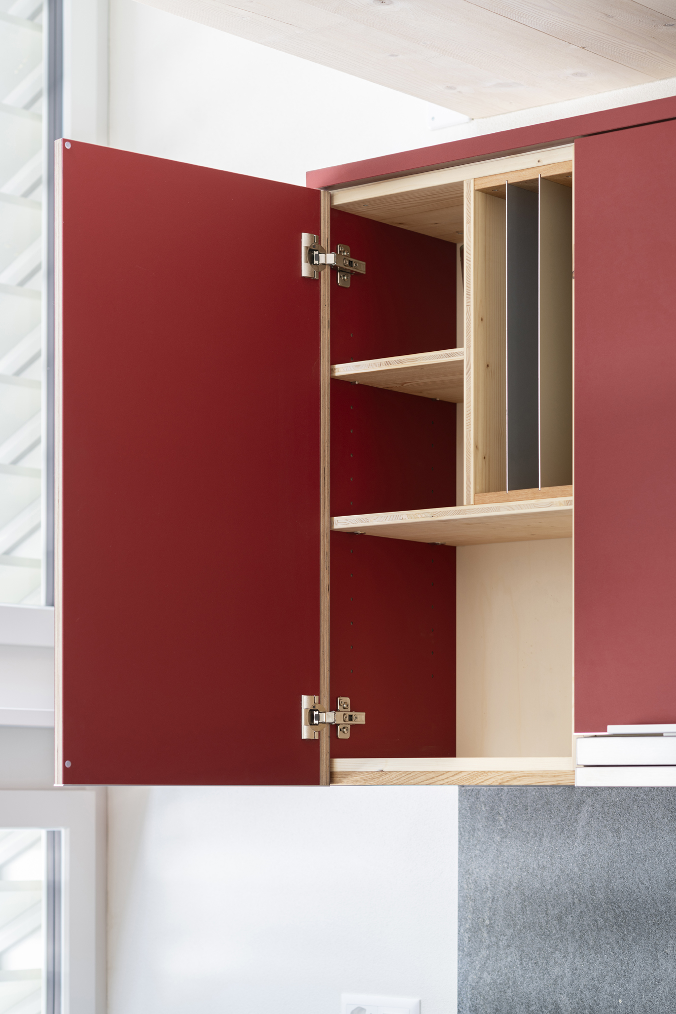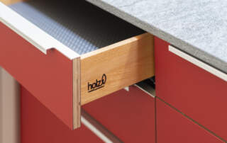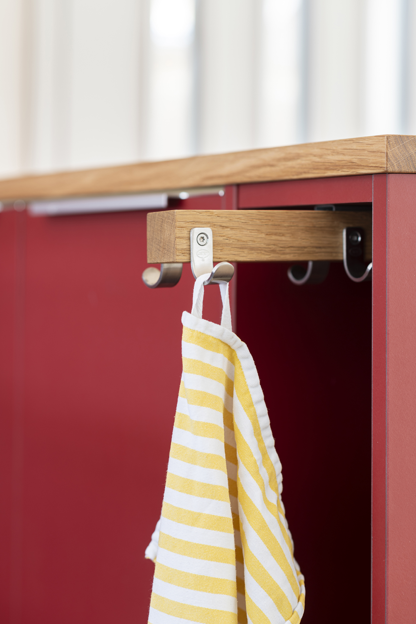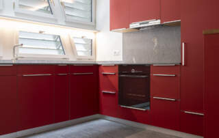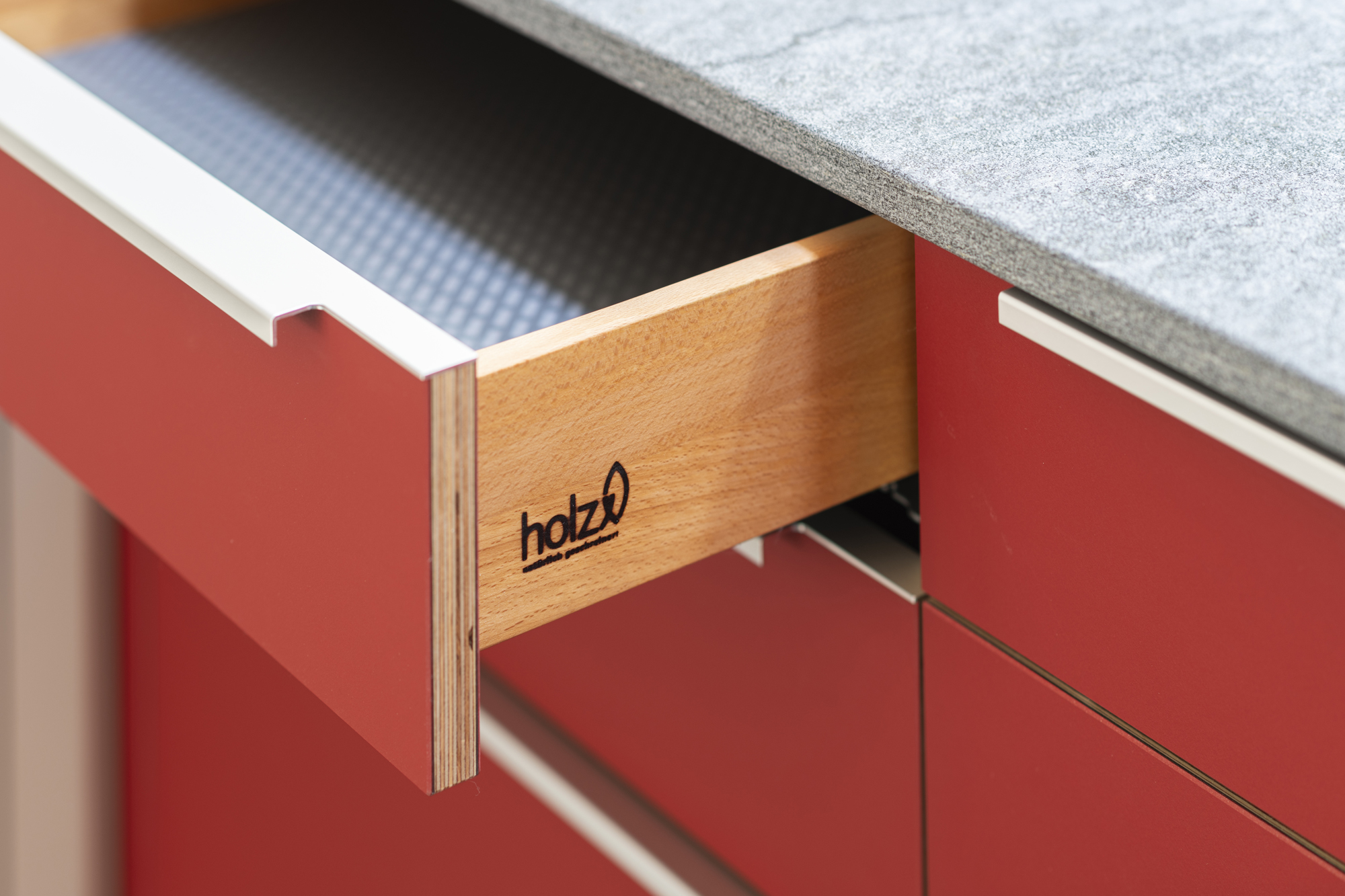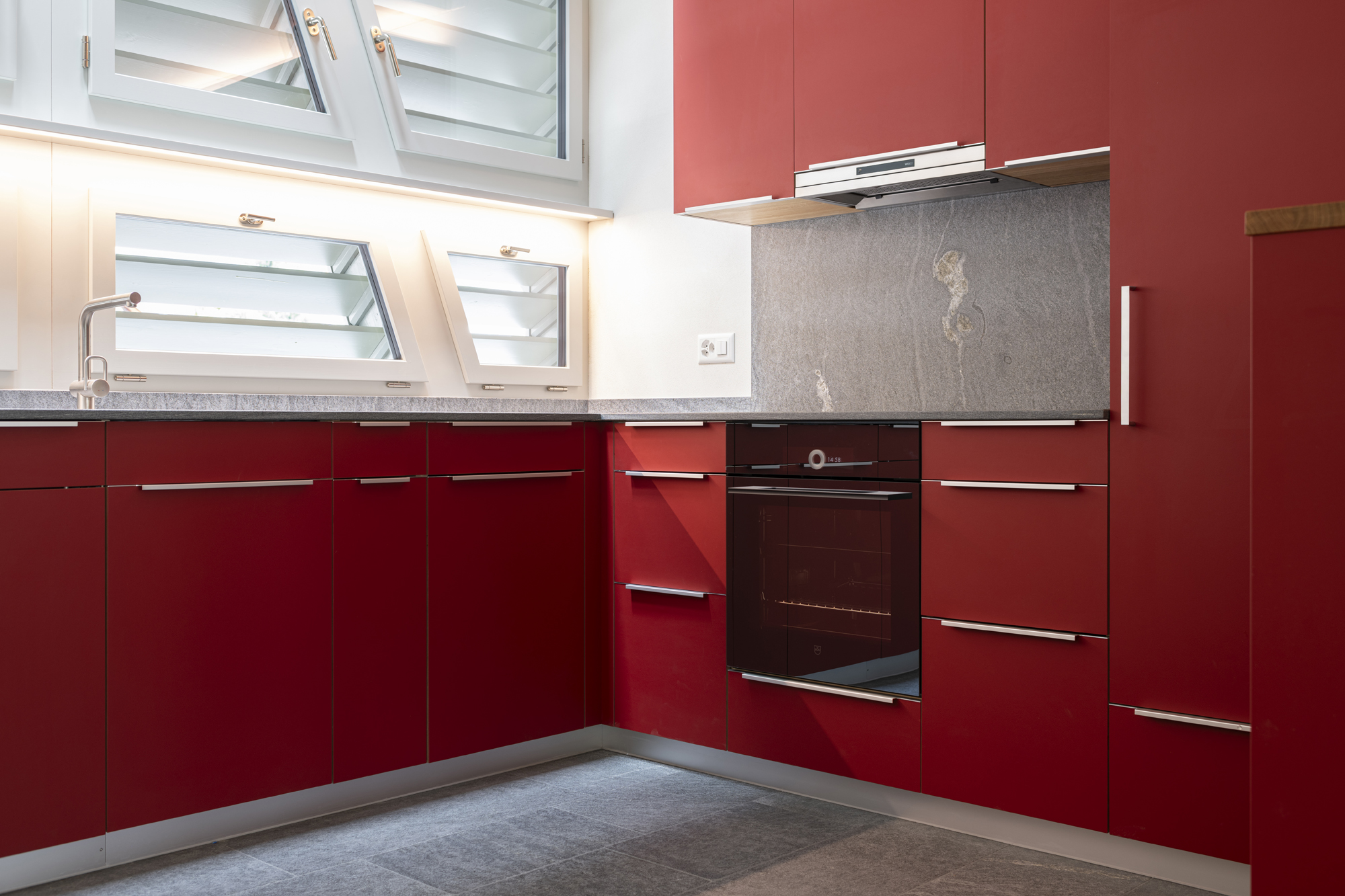 • Massivholzküche mit belegten Lino-Fronten in "Salsa-rot".