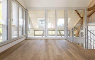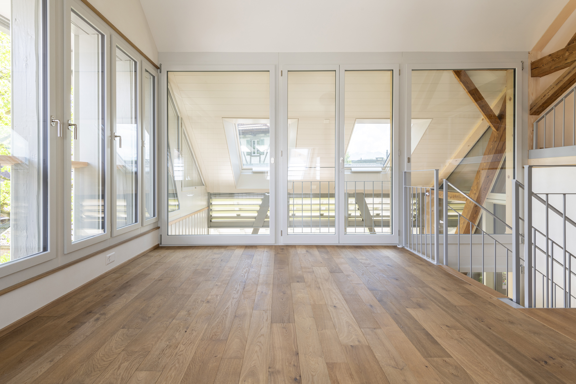 • Parkett Landhausdiele Eiche massiv, leicht gebürstet.